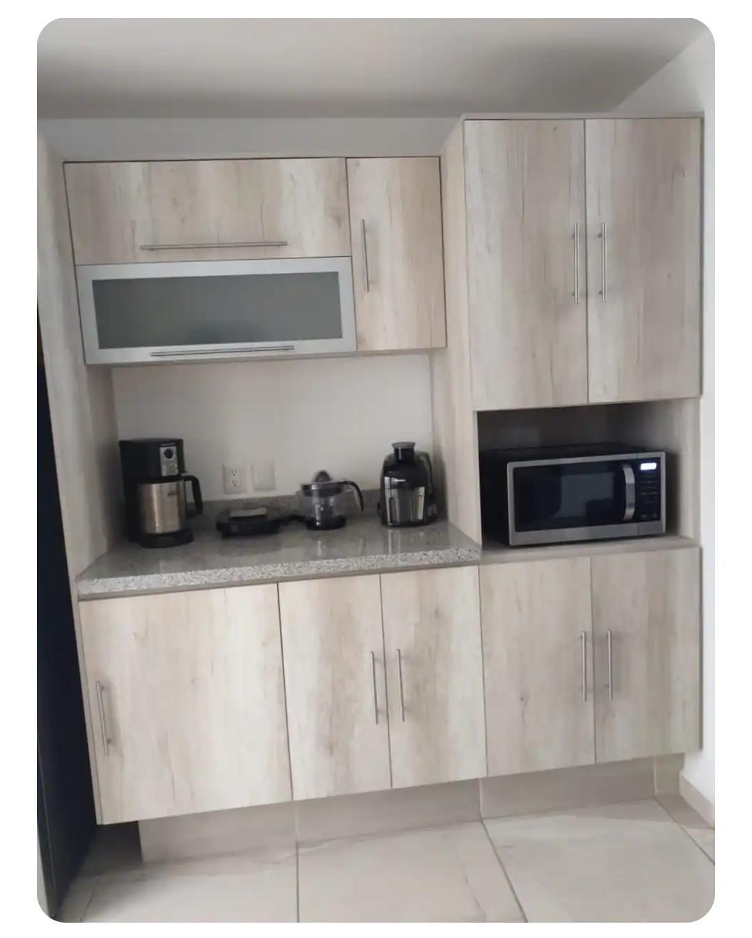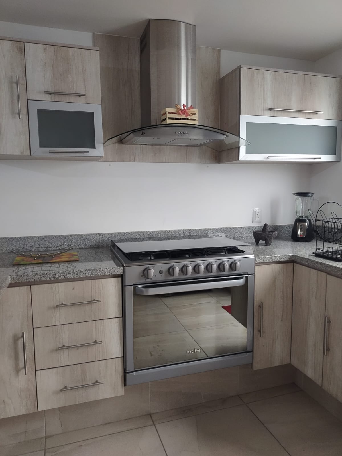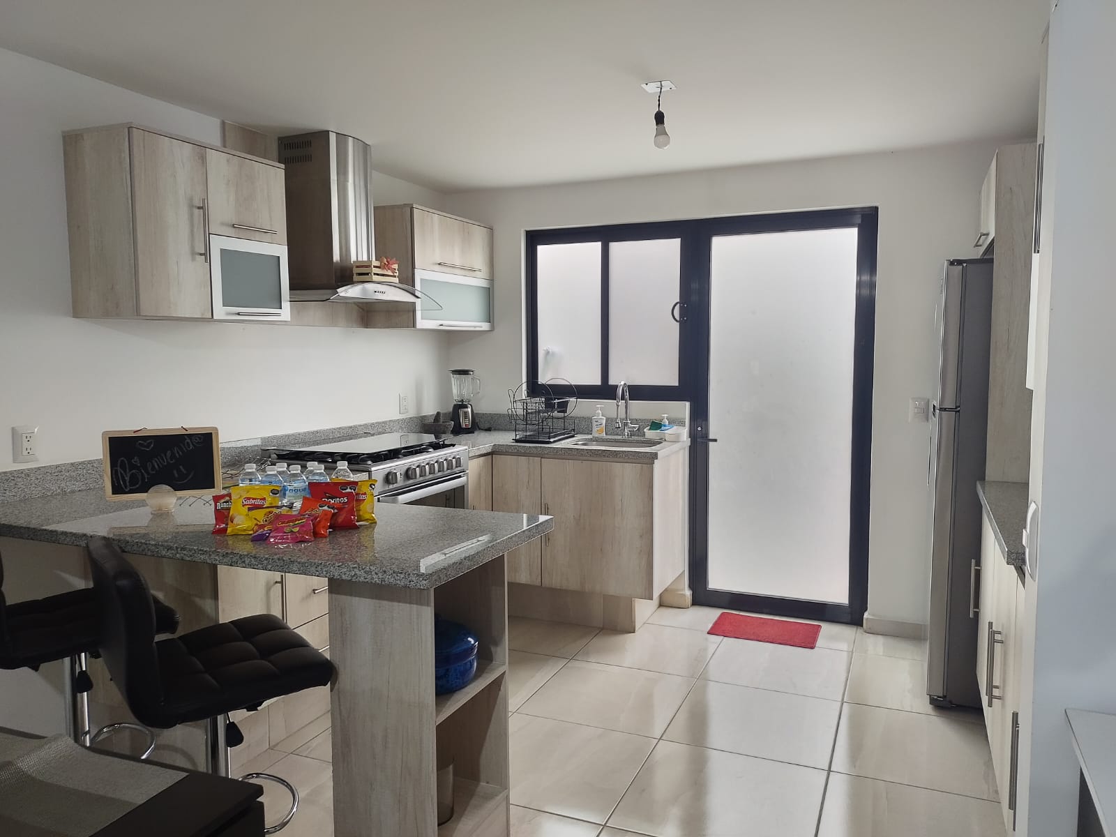 Estufa, refrigerador, utensilios, ollas y más, todo listo para preparar tus comidas.