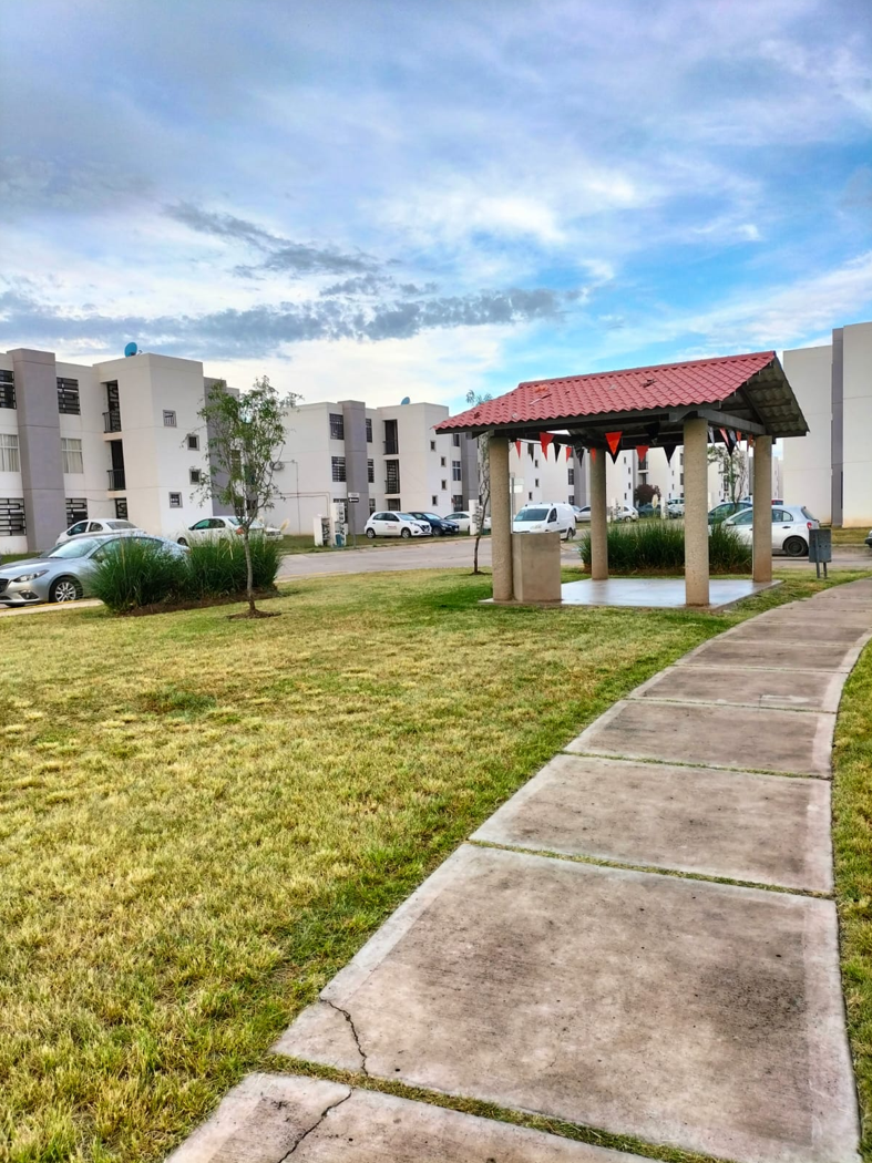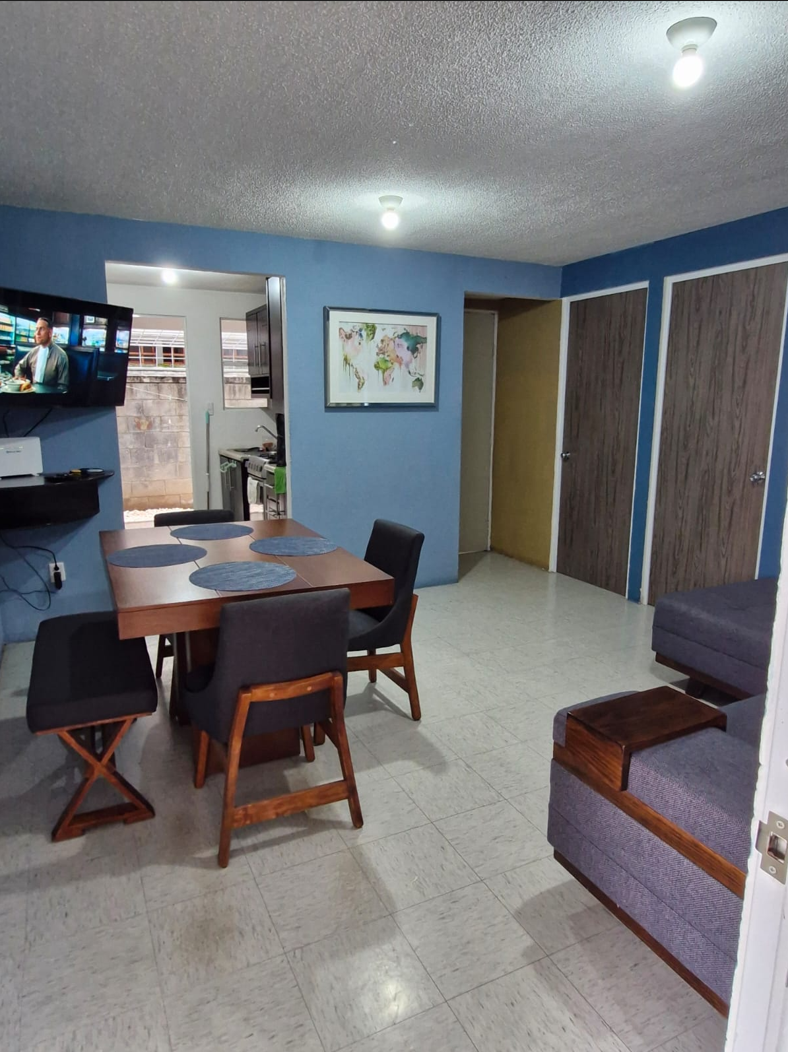 El departamento cuenta con 2 recamaras ambas con cama matrimonial y closet, 1 baño completo, sala comedor con Tv, cocina integral equipada, refrigerador, microondas, estufa con horno, cafetera, licuadora y utensilios de cocina. Cuenta con un patio protegido con herrería, mueble de servicio, 1 lavadero, tanque de gas de 30 kg, boiler de paso y 1 asador, además de que el circuito cuenta con amenidades como palapas con asadores, cancha de deportes, aparatos de ejercicio y área de juegos infantiles. Se incluyen servicios (Luz, agua, internet y mantenimiento del fraccionamiento). No mascotas.